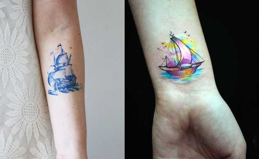 Небольшие картинки с парусниками будут интересно смотреться на плече, лопатках, голени или запястье. Такие татуировки как раз чаще всего выбирают девушки. Изображение может быть как монохромным, как и цветным, любой вариант будет смотреться естественно и интересно.