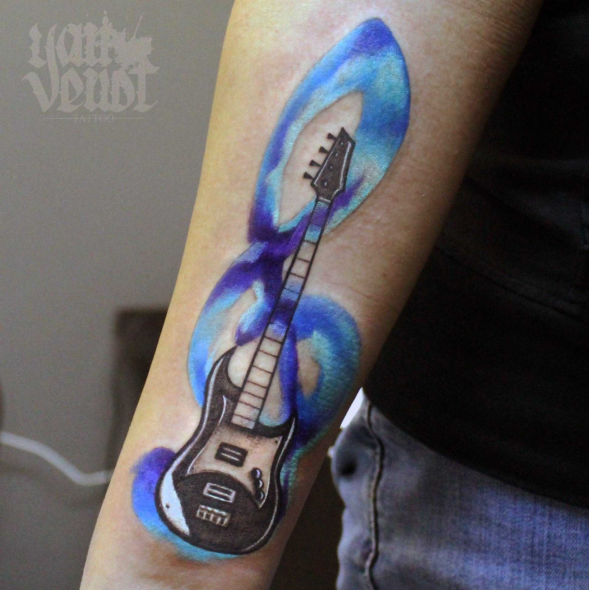 Тату с изображением гитары, иногда дополняют штрихами, котрые указывают приверженность ее владельца к тяжелой рок музыке