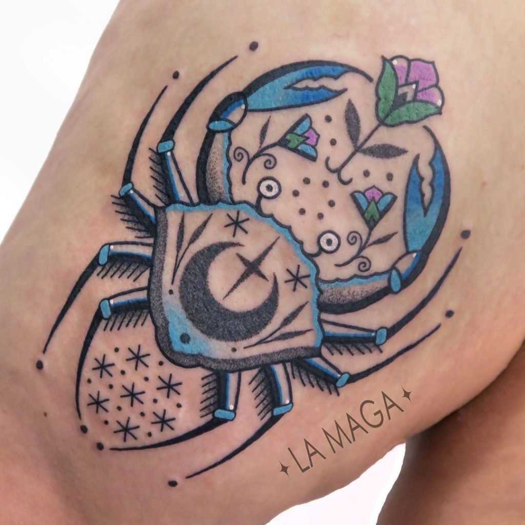 Людям, рожденным под созвездием Рака, тату с символом или изображением покровителя послужит талисманом удачи.