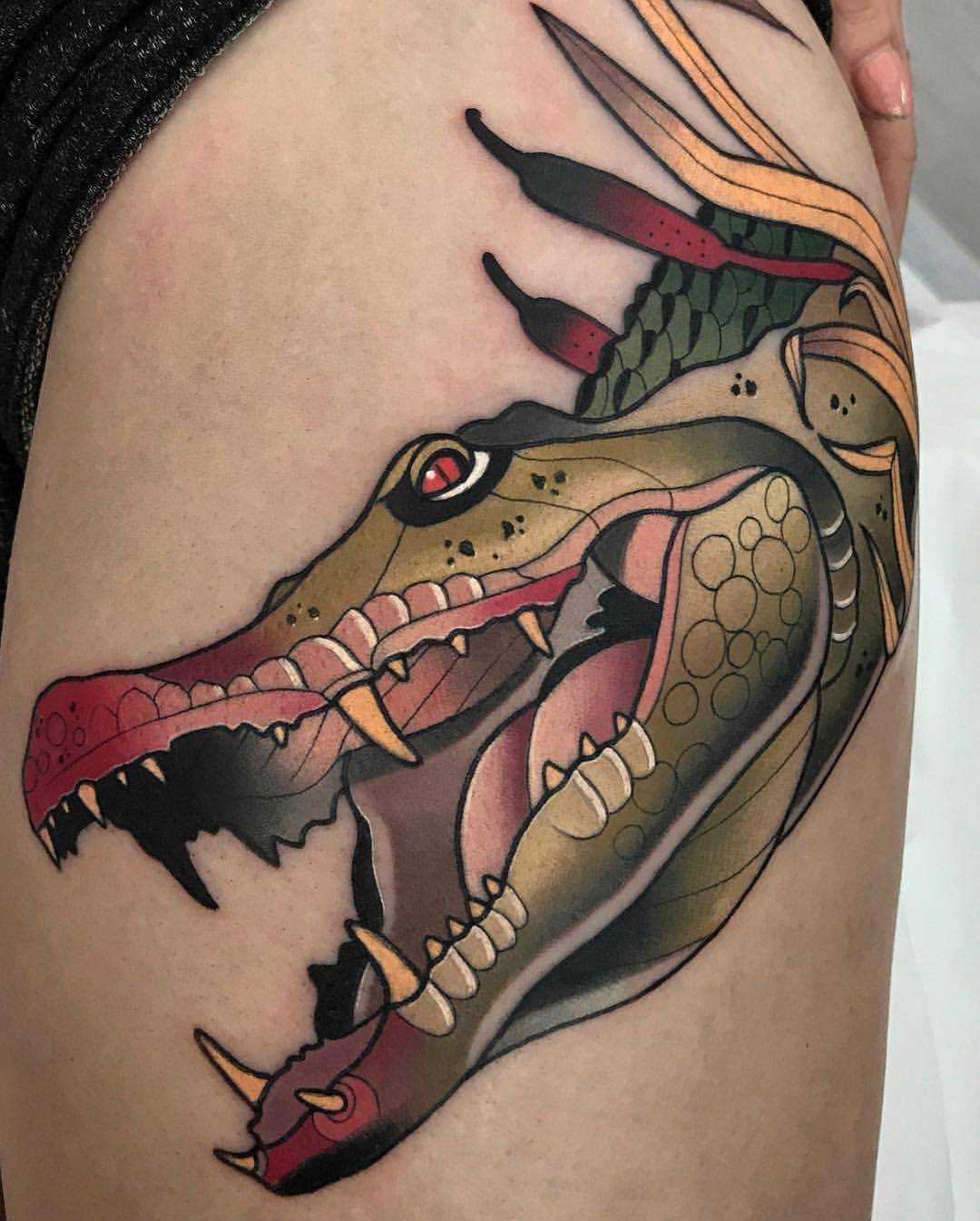Цветной и довольно объемный крокодил представлен здесь в образе сказочного существа, но добром от него не веет точно. Для такой татуировки понадобится основательная площадь на теле, да и работа предстоит долгая и кропотливая.