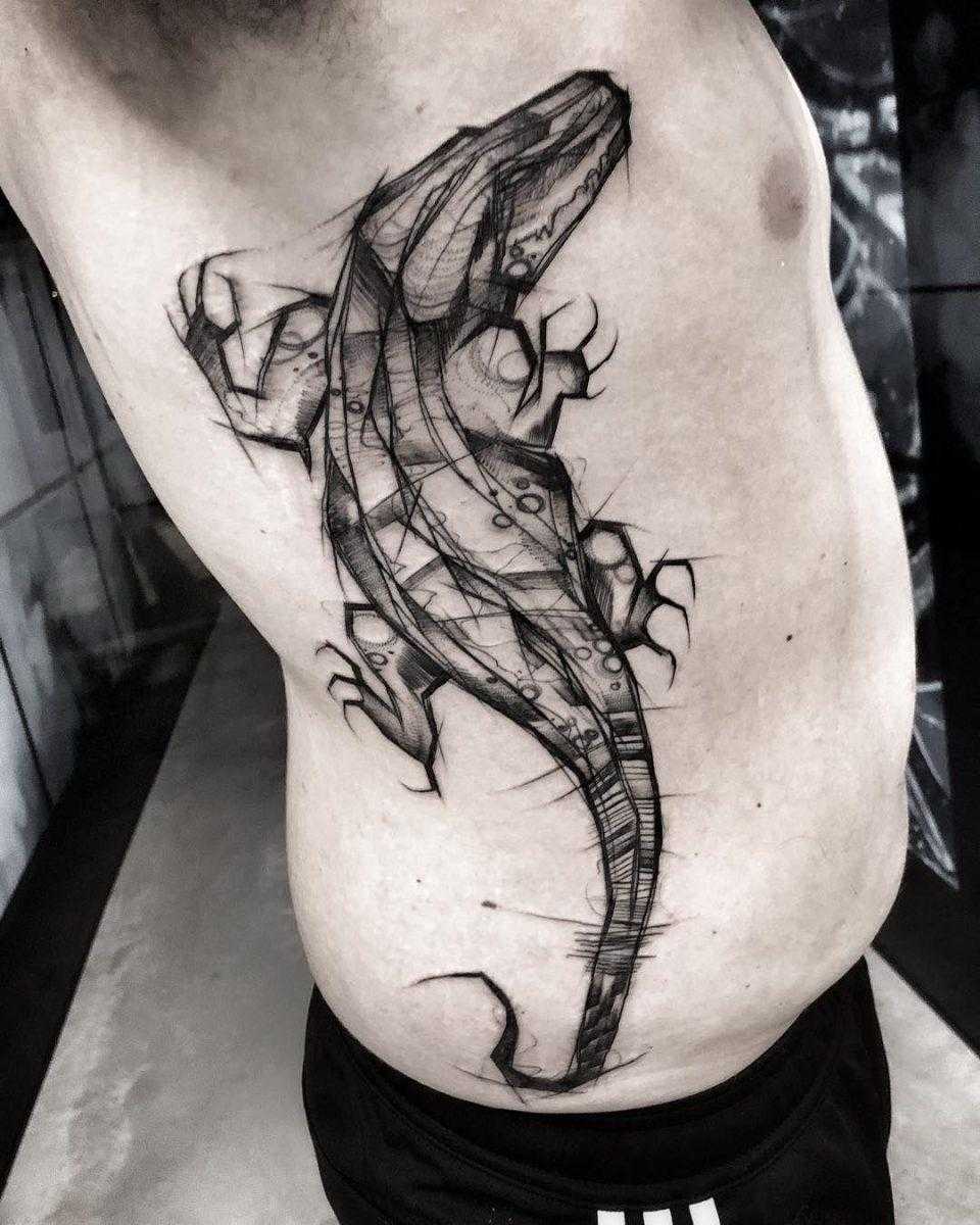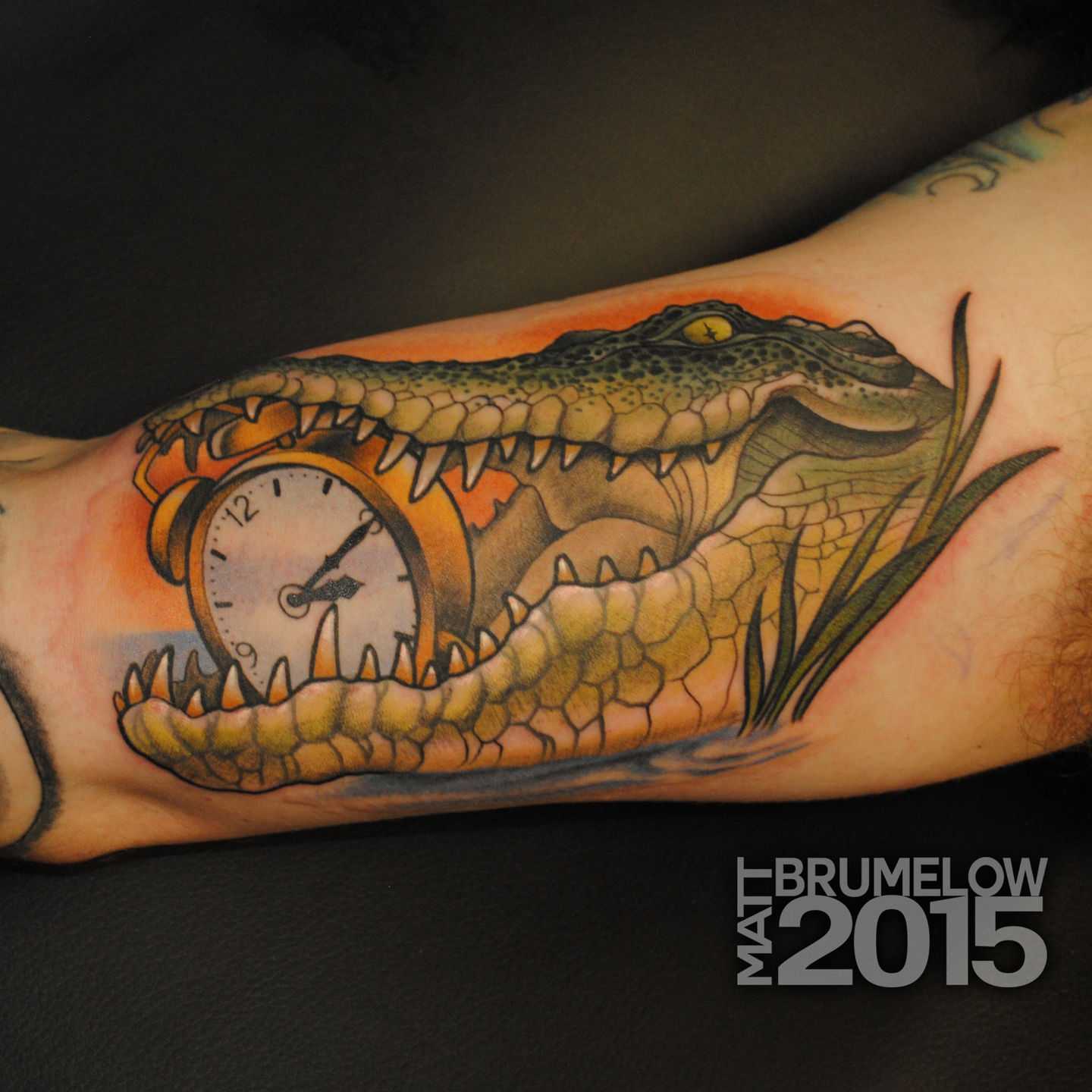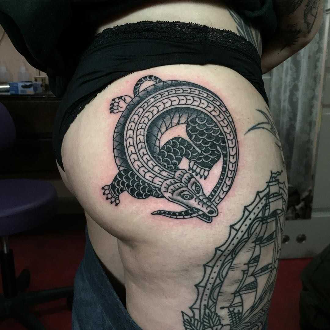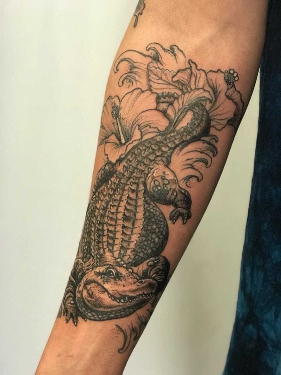 Тату крокодила на руке встречаются чаще всего, сама форма изображения говорит о том, что это одно из самых подходящих мест. Довольно гармонично смотрятся работы на бедре или голени, на боку или лопатке.