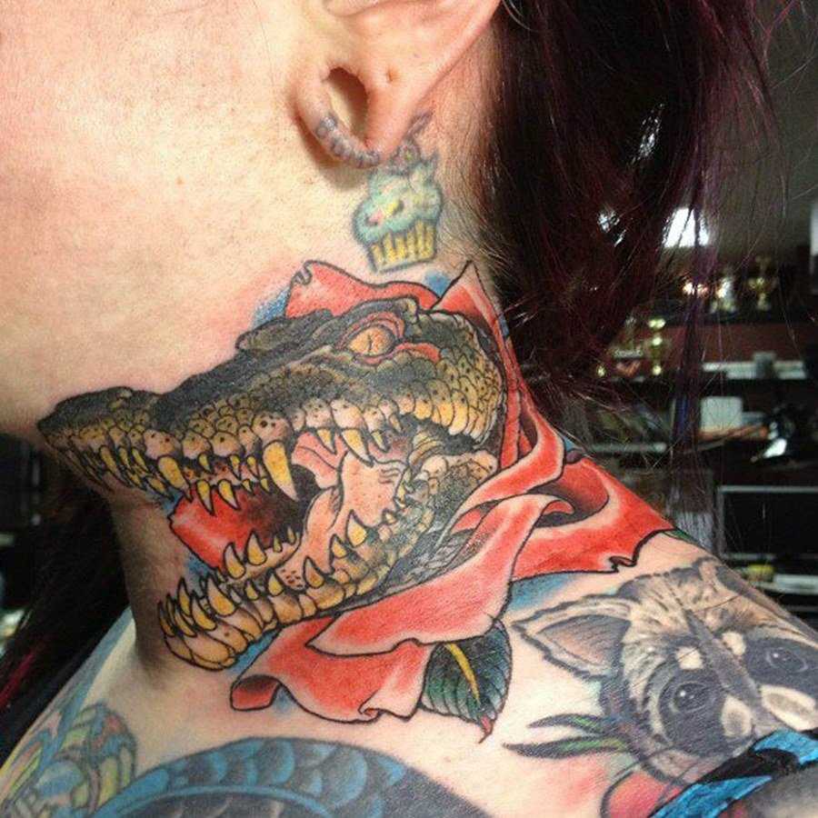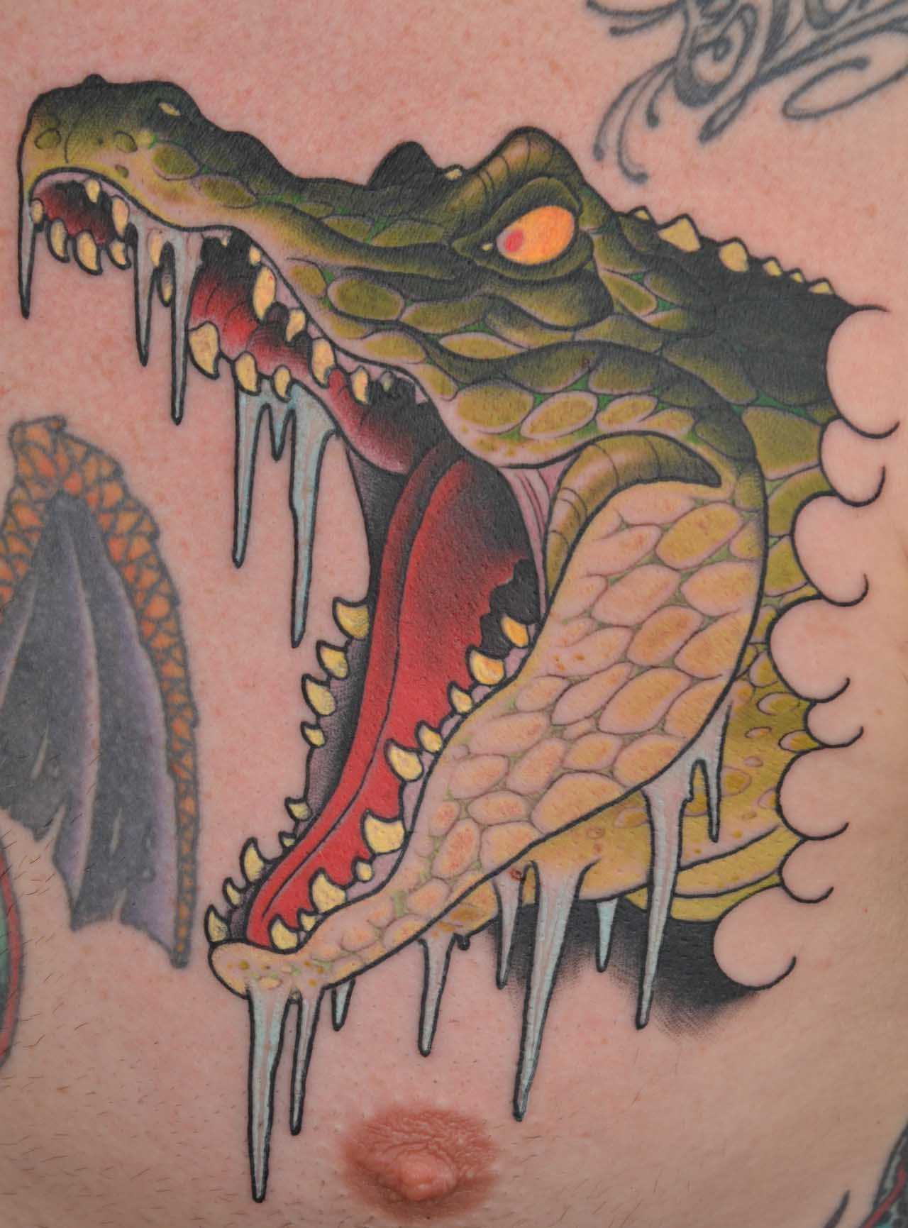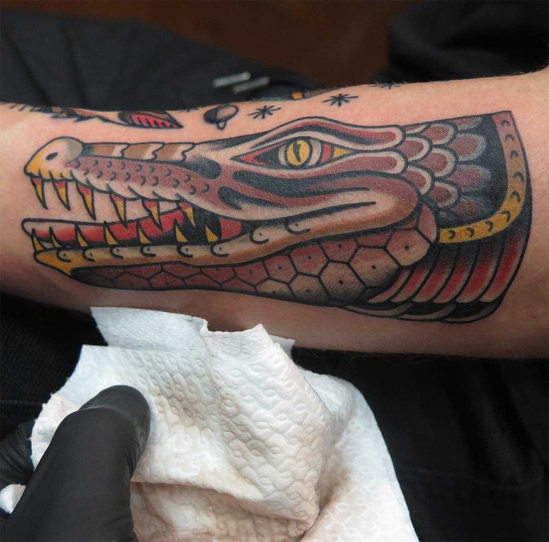 Агрессия и жестокость — скрытый смысл тату, на котором крокодил изображен с окровавленной пастью, полной острых зубов