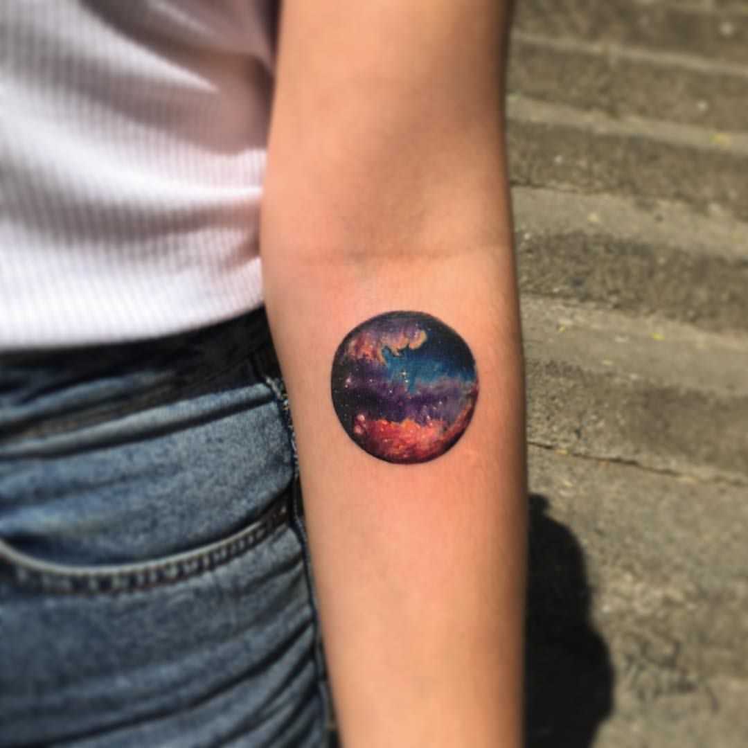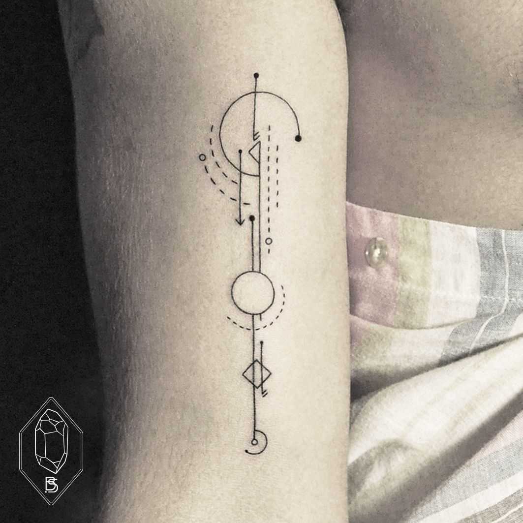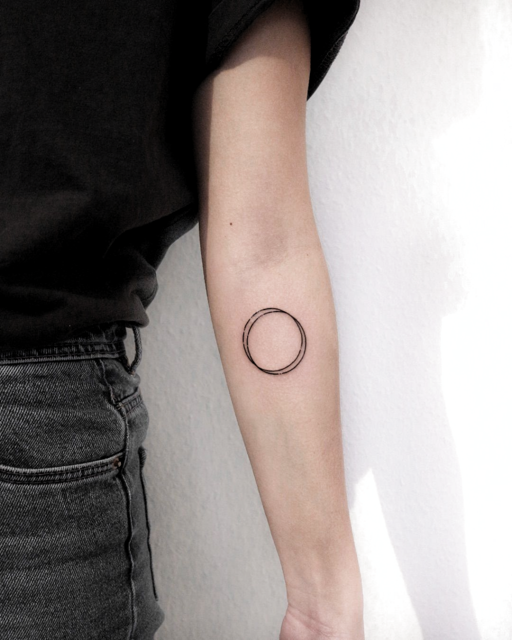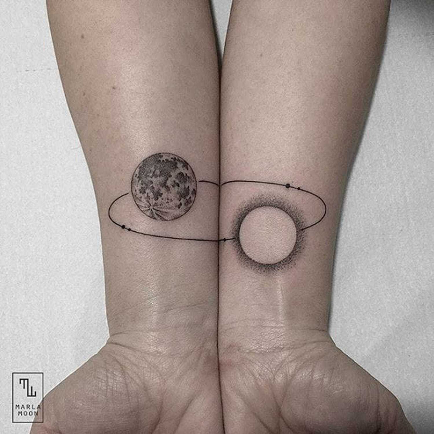 - Мастера татуировки могут предложить множество вариантов исполнения эскиза. Это и лаконичная геометрия с сочетанием темных, полностью заполненных цветом кругов со светлыми формами, состоящими только из контуров. Такой эскиз можно дополнить параллельными линиями, что символически будет обозначать солнечную систему или образ планет, больших и малых.