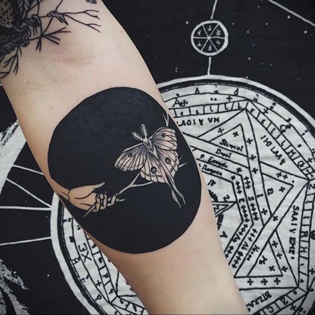 Татуировка с черным кругом и перьями выглядит очень эффектно как на женском, так и на мужском теле.