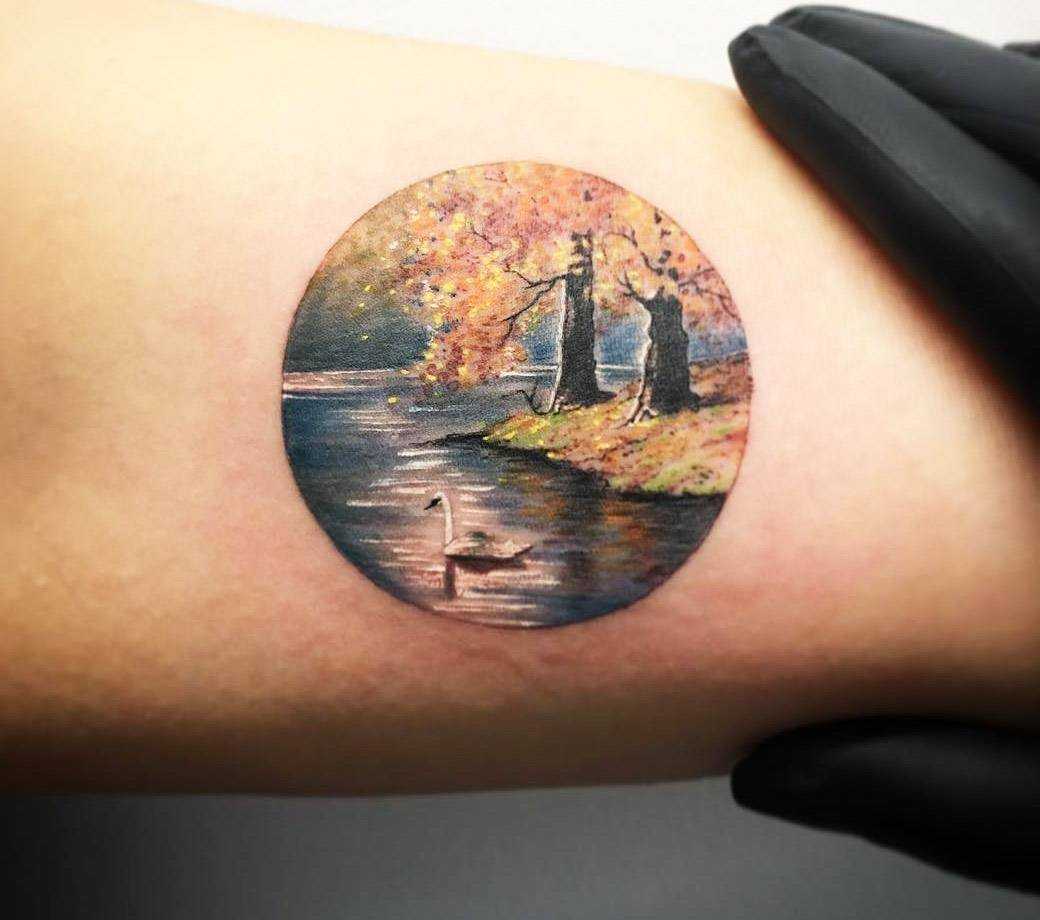 Татуировка в виде круга выглядит очень эффектно во все стилях. Особенно эффектно изображение смотрится в стиле олдскул. Такой нательный рисунок выбирают как мужчины, так и женщины. Изображение отличается выпуклостью и красочностью.