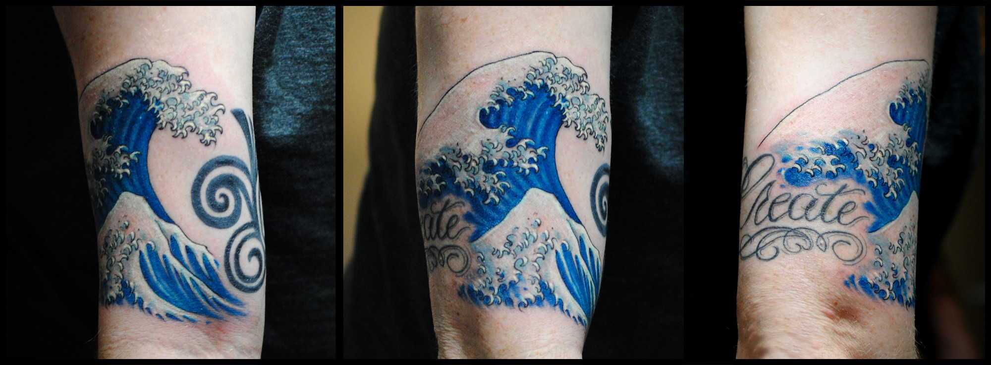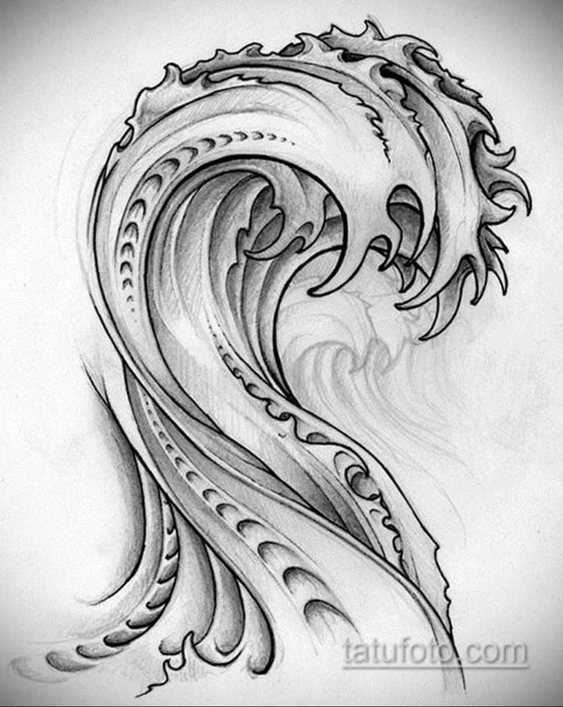 СПРАВКА: По вопросам композиции рисунка обращайтесь за советом к тату мастеру или салонному художнику. От того, как будет расположены гребни волн и какая атрибутика сопроводит рисунок будет зависеть смысловое значение тату.
