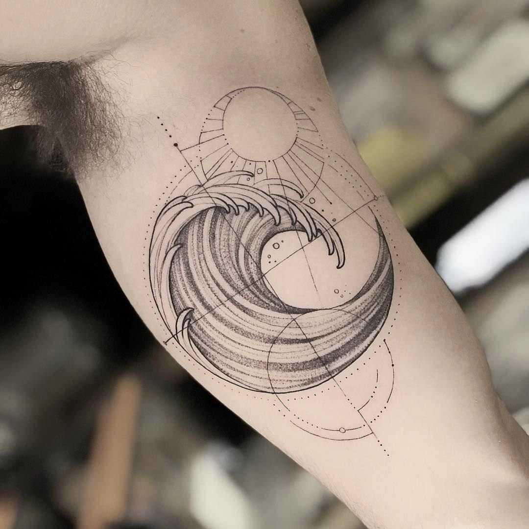 Татуировки море часто выполняют в геометрических формах. Особенно популярны тату в круге, поскольку круг близок по значению к морю. Круг символ бесконечности и вечного движение. Сочетание моря и круглой формы усиливает смысл тату.