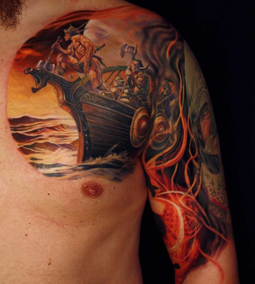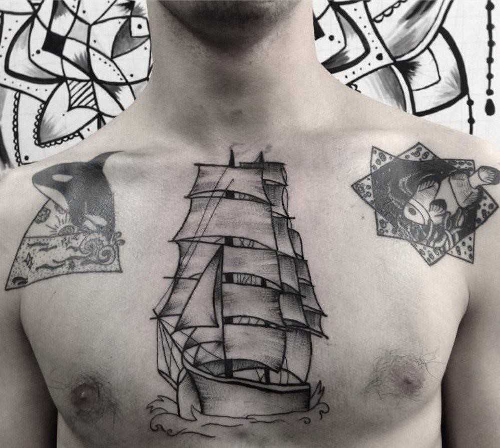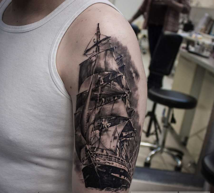 При этом важно отметить, что место на теле для нанесения татуировки не играет роли, ведь значение наколки от этого никак не изменится. Популярные части тела для нанесения тату с изображением корабля для мужчин: плече, рука или спина