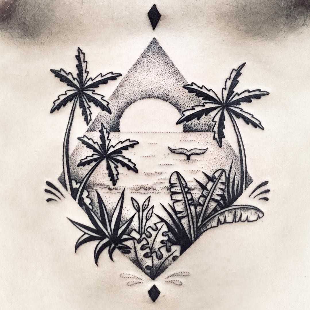 Татуировку с морской стихией можно сделать в любой стилистике. Черно-белые рисунки лучше изображать в техниках, которые емко передадут основную суть изображения: лайнворк, минимализм, дотворк, графика.