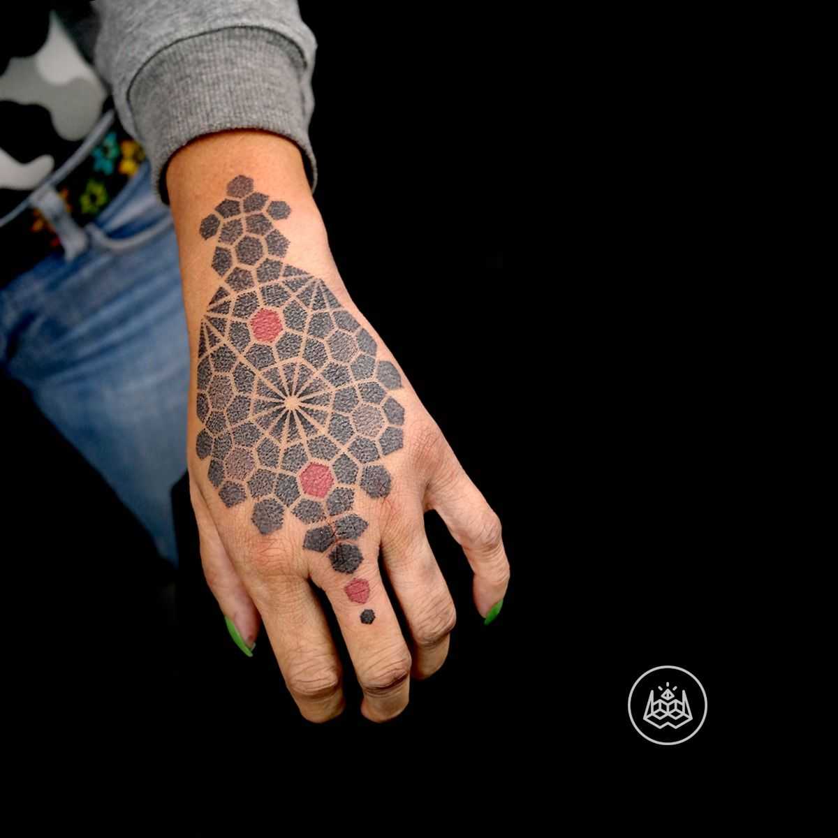 Татуировки, выполненные в стиле дотворк, состоят из множества точек разного диаметра. Главная роль в дотворке отведена строгим геометрическим формам и орнаментам.