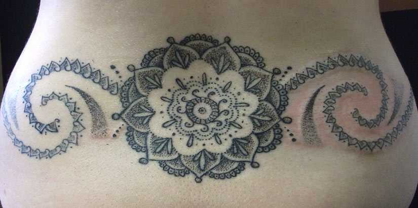 Также красиво будет смотреться мандала на спине девушки. Однако стоит подумать о том, где именно будет размещен центр рисунка. Специалисты рекомендуют внимательно изучить схемы расположения основных энергетических центров на теле человека. К примеру, на спине только основных (чакр) три. Это 2, 3, и 4-я чакры. То есть, области, начиная с пояснично – крестцового отдела, и заканчивая грудной клеткой. Небольшие центры есть и на других участках человеческого тела.