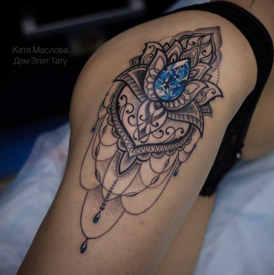 Для мужчин не свойственны тату в области бедер. Джентльмены украшают наколками только зону ниже колен.