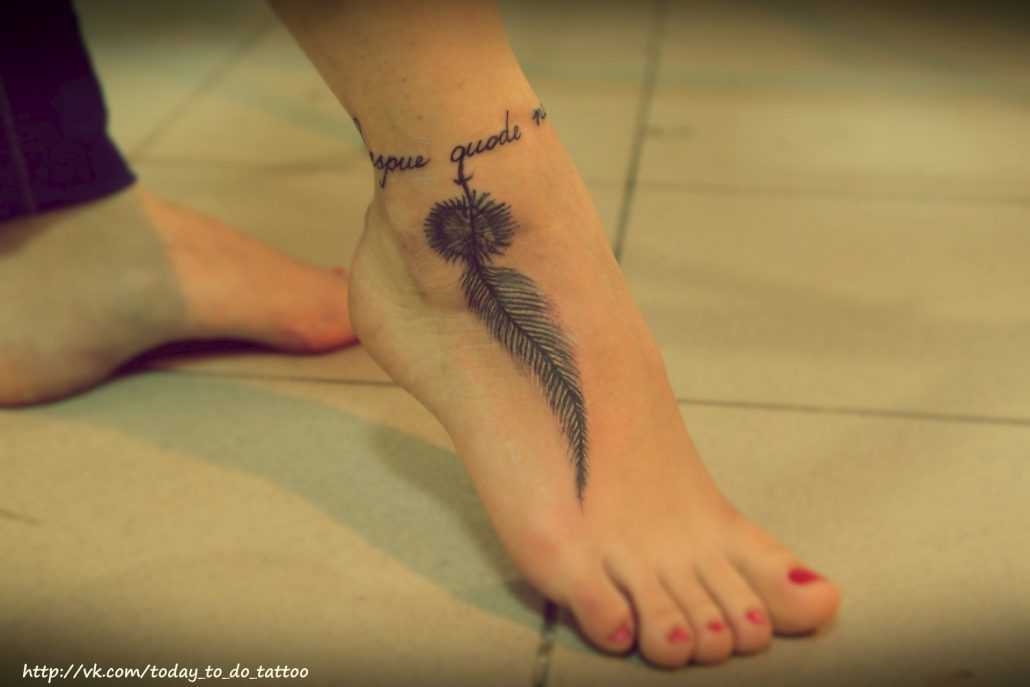 Из птичьей тематики, классическими женскими тату для области ног считаются перья павлина. Обычно, их изображают на стопах.