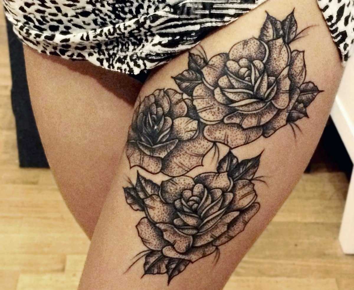 К преимуществам работы на этом участке тела относят безболезненность, т.к. поверхность бедра имеет достаточно плотную текстуру. Если рисунок масштабный, то это влечет за собой визуальное изменение фигуры.