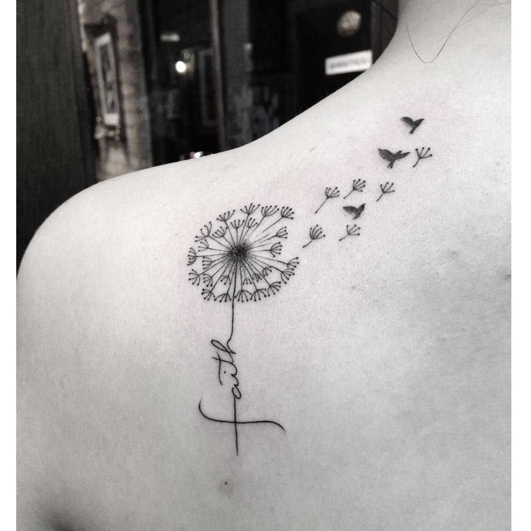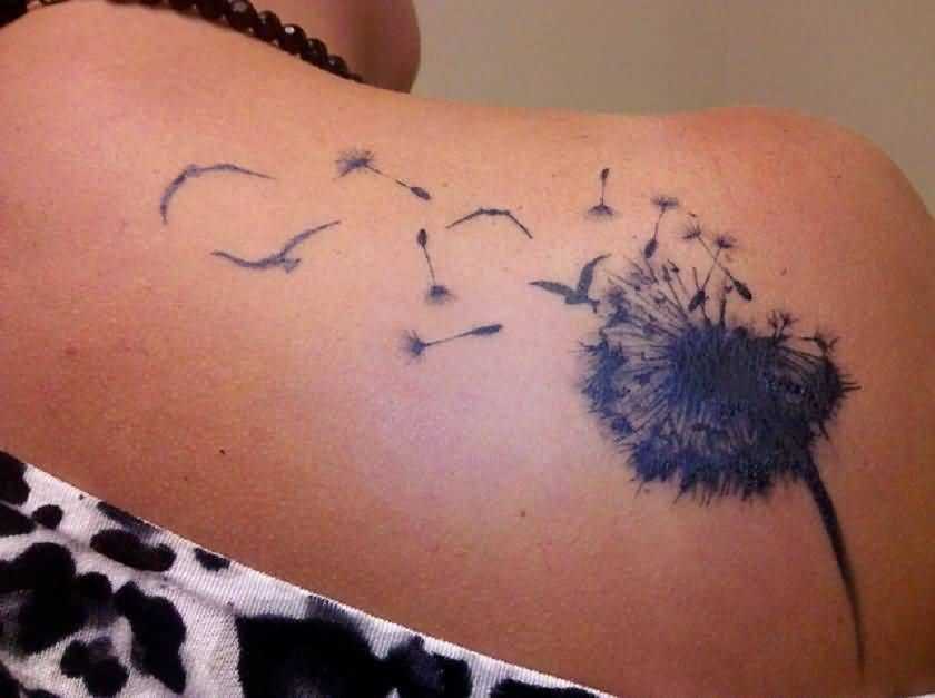 Более масштабная татуировка одуванчик на лопатке или спине будет смотреться уместно.