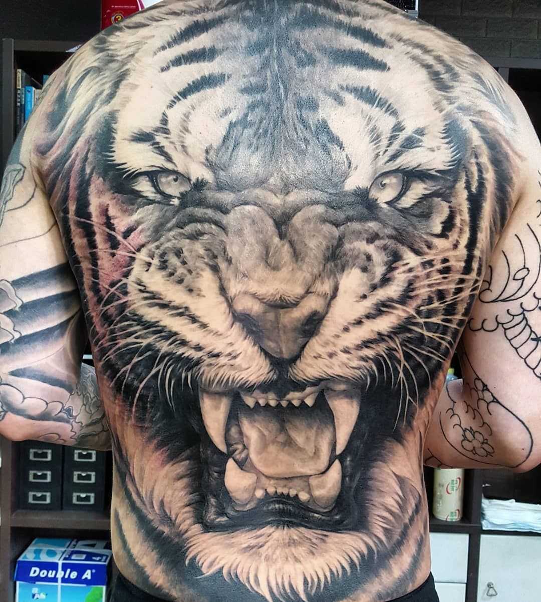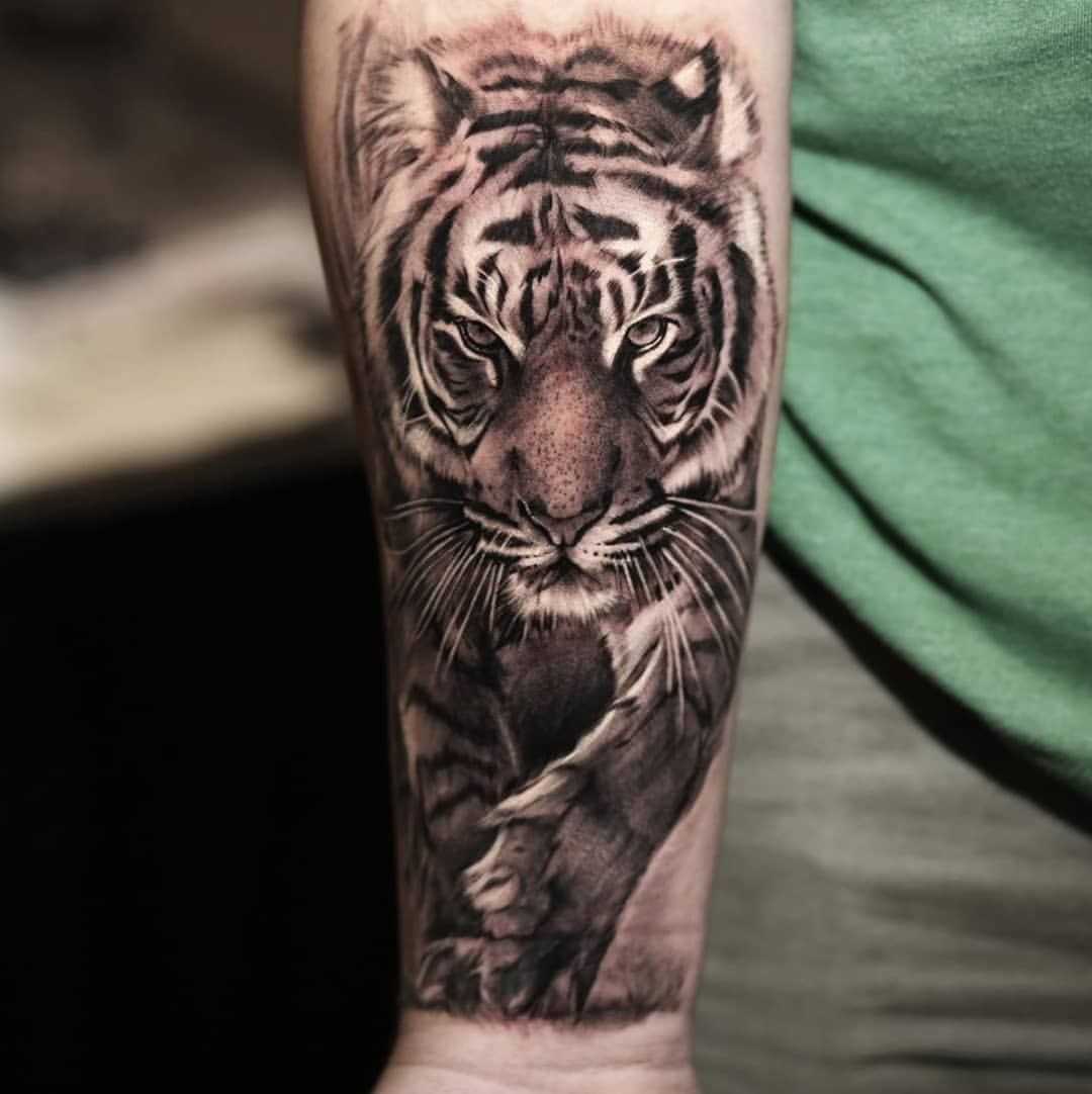 Такие тату могут указывать на силу, уверенность в себе и психологическую стойкость. Чем красочнее татуировка, тем в большей степени рисунок свидетельствует о страстном и сильном характере. Человек, который открыто демонстрирует татуировку с тигром, обычно хочет выразить уверенность в себе и тот факт, что он считает себя альфа-самцом.