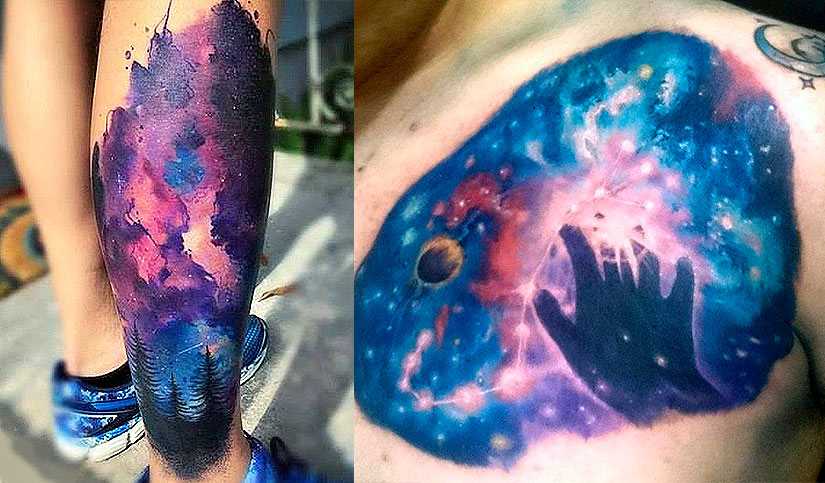 на сегодняшний день является одной из самых популярных тематик. Это объясняется тем, что вот уже пять лет как космическая тематика буквально окружает нас со всех сторон. Поэтому художники всего мира, в том числе и татуировщики, вдохновляются цветными хаотичными пятнами и компонуют их в довольно привлекательные формы. Разбавляется цветной фон темными пятнами планет и белыми бликами звезд.