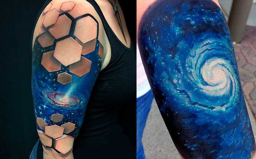 – это аналог тату космоса. Эскизы таких работ есть в портфолио любого тату-мастера. Галактика состоит из обилия черных пятен, которые разбавляются цветными планетами и звездами. Такая интерпретация тату космоса очень популярна среди молодых парней. Они забивают ей большие участки тела. Такой рисунок очень броский, поэтому его предпочитают носить творческие личности, которые не боятся самовыражения.