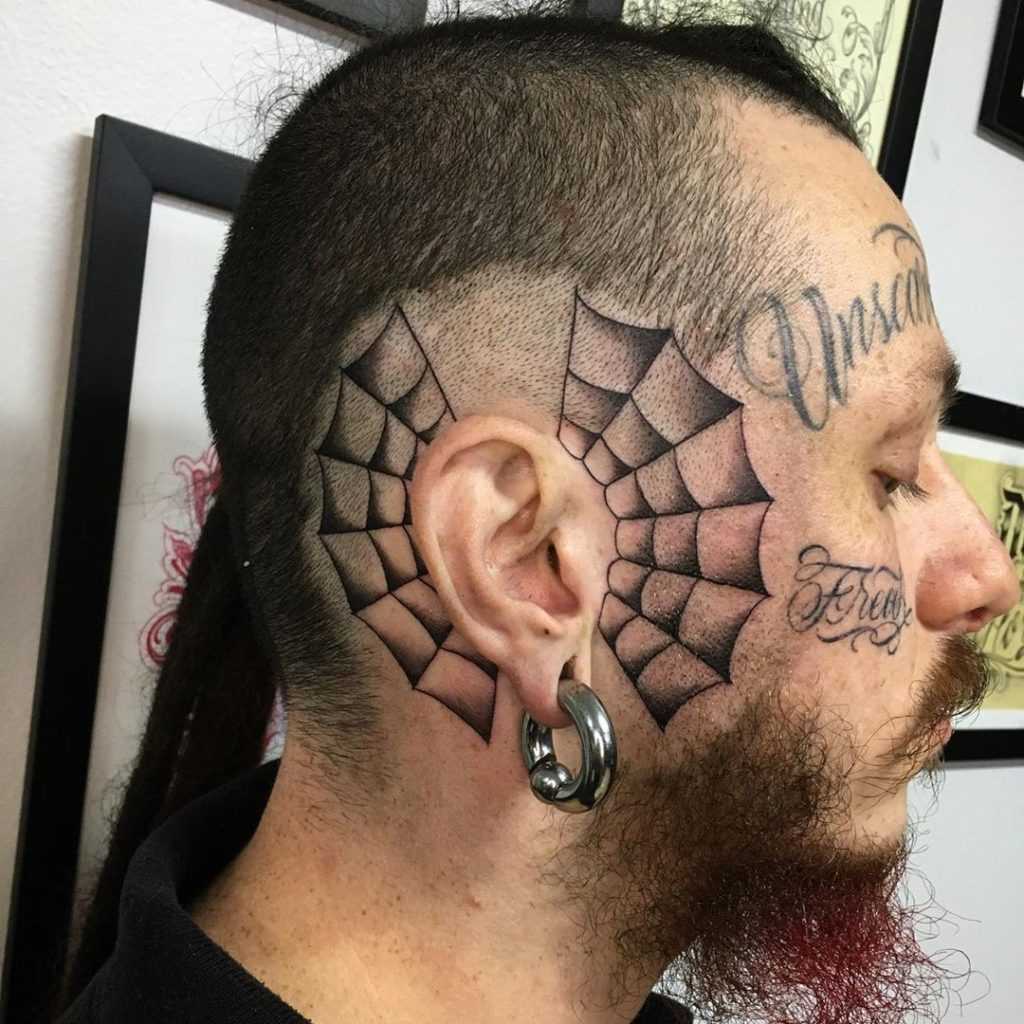 Тату, в принципе, редко встречается на голове. А уж паутинообразное изображение тем более. Внешняя броскость и экстравагантность, а также сильная болезненность при накалывании отбивают желание сделать тату на голове.