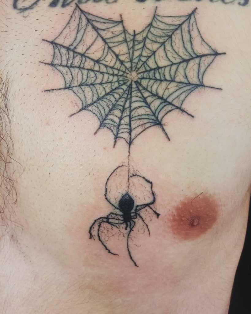 Наколка на таком месте распространена по понятным причинам в большей мере среди мужчин. Она встречаются в составе больших композиций. Тату благодаря обилию тонких линий эффектно подчёркивает рельефность мышц, придаёт объём. Тату паутина на груди часто бывает выполнена в ярком стиле. Но она и без того бросается в глаза из-за местоположения.