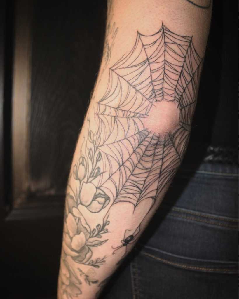 Татуировка паутина эффектно смотрится в стиле реализм. Благодаря детализации, четким контурам и оттенкам рисунок больше напоминает реальное фото. Иногда в композиции есть паук, череп, роза или насекомые. Большое тату лучше делать на руке или ноге.
