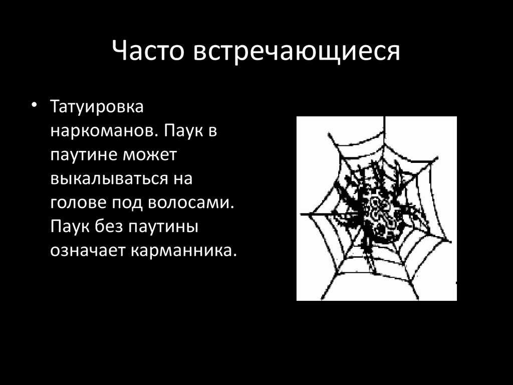 Слышал, что «паука» (обычно с крестом на спинке и сидящего на паутине) в настоящее время себе накалывают наркоманы. Тату делают на грудной мышце или подмышкой на боку.