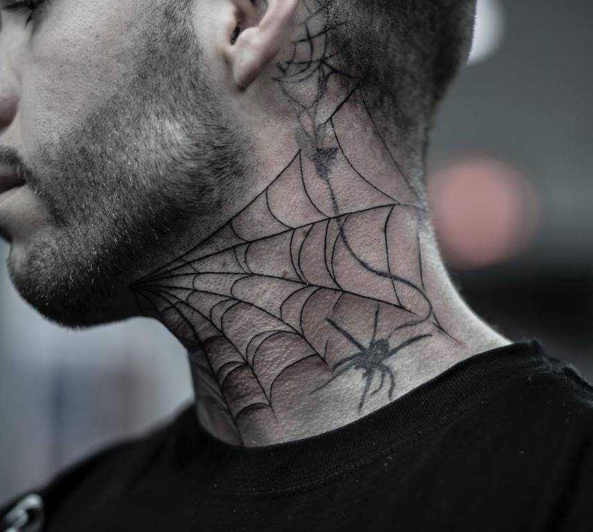 Представители сильной половины человечества часто выбирают татуировку паутина. Наносят её как самостоятельное изображение или как красивую часть композиции. Хорошо смотрится объемный рисунок в области шеи, плавно переходящий на плечо.