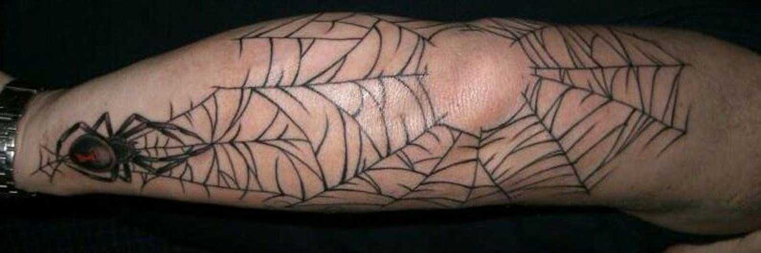 Эффектным вариантом станет . Изображение может быть очерчено тенями и иметь различные размеры. Такой рисунок выгодно подчеркнет рельефность мышц. Самой популярной областью нанесения считается сгиб локтя. На данном месте паутина не только приобретает особый смысл, но и находится в движении.