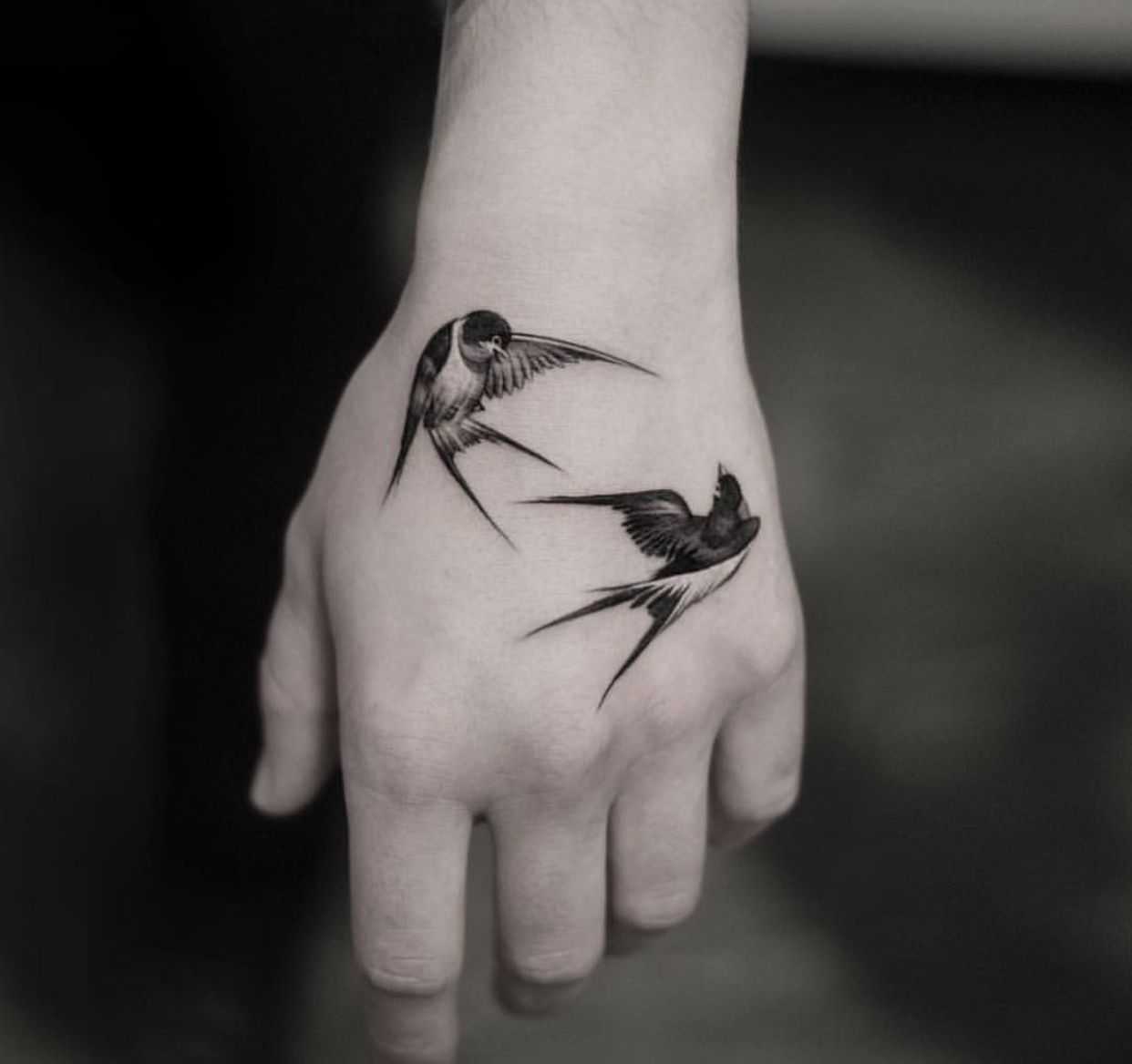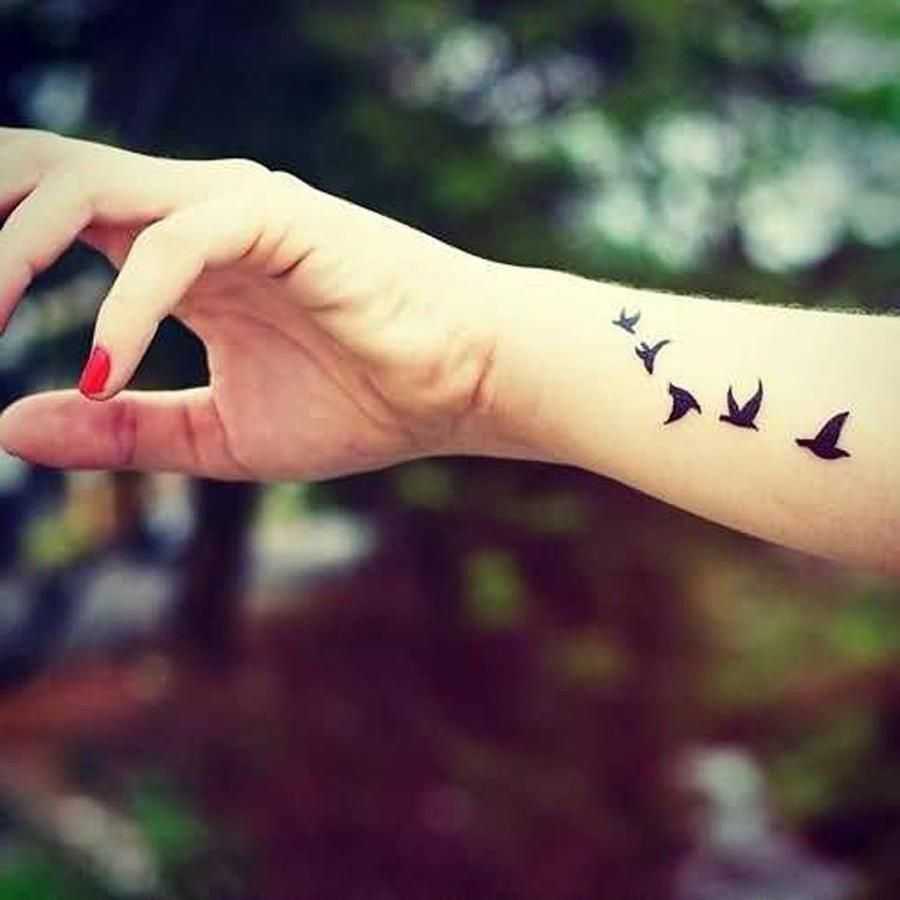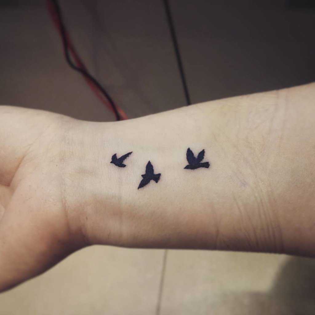 О да, если вы слышите о птичках на запястье, в 95% случаев имеются ввиду эти птички. Они очень-очень популярны — вбейте в поисковик название и увидите сотни, тысячи подобных рисунков. Если хочется оригинальной «не-как-у-всех» тату, советуем выбирать другое изображение или немного изменить под себя эту стаю. К сожалению, синоним к птичкам на запястье — «заезженность».