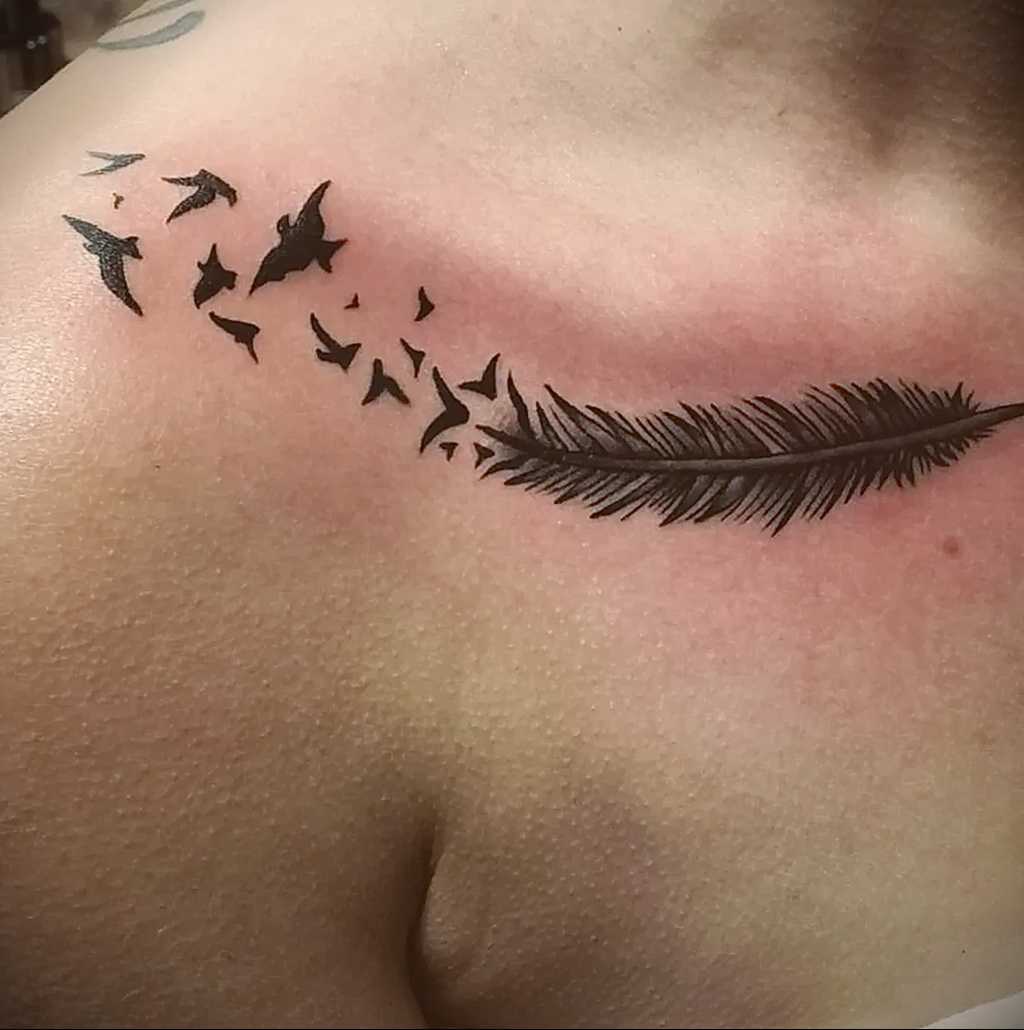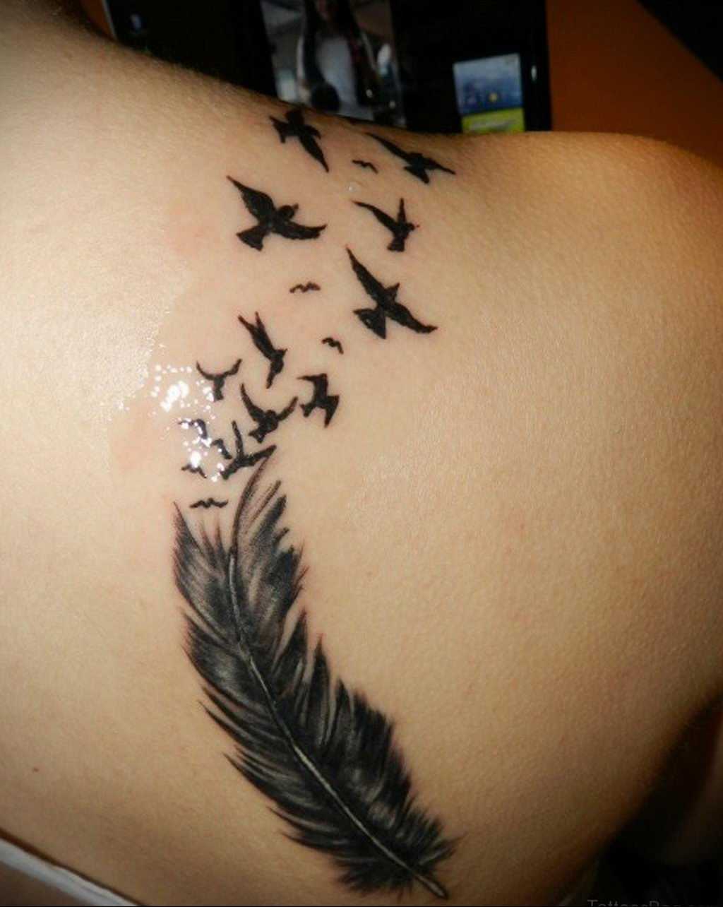 Татуировки в виде перьев с птицами. Смысл этого мотива — свобода, независимость и сила духа. Сегодня это один из самых популярных мотивов для девушек.