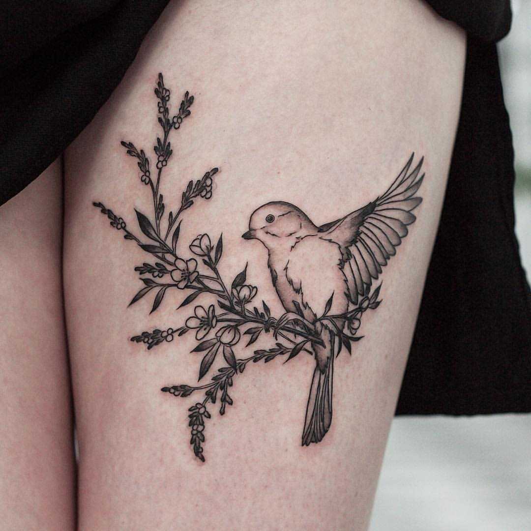 - Ветвь дерева с птицей, что взлетает с нее – стремление к свободе и независимости, мечтательность. Зачастую подобное тату используют молодые представительницы прекрасного пола, символизируя надежды на светлое и беззаботное будущее.