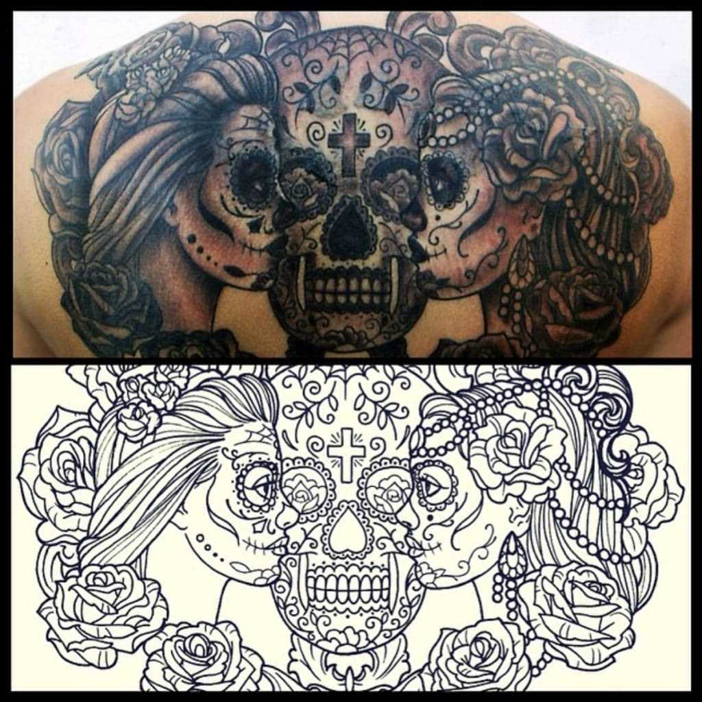 Если вам кажется, что череп может быть немного одиноким, Вы всегда можете сопровождать его элементом, который помогает дополнить татуировку., как эти две катрины, которые придают ему очень оригинальный вид. Катрины, кроме того, дают большую игру для реалистичной татуировки, в отличие от версии, основанной на типичной сладости этого праздника.
