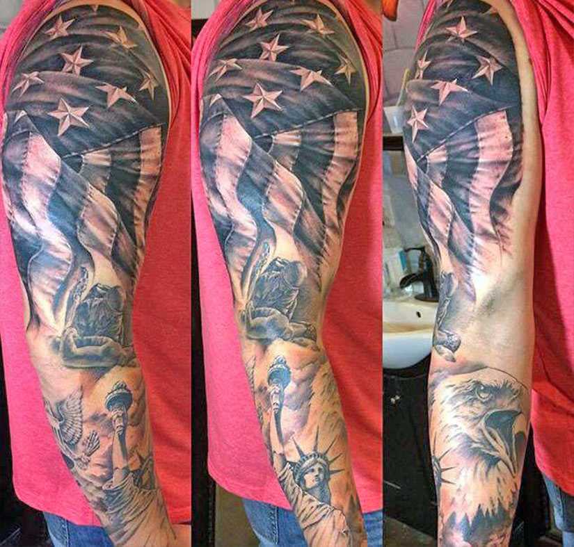Впрочем, не все клиенты заказывают изображение, требуя сделать его каноничным. Если речь идёт о поклонниках традиционных идей, они часто просят сделать наколку статуя свободы с флагом, американским символом – белоголовым орланом. Такие эскизы наносятся заказчика, и занимают обычно большую площадь. Если вы не американец, можно использовать флаг и герб именно вашей страны.