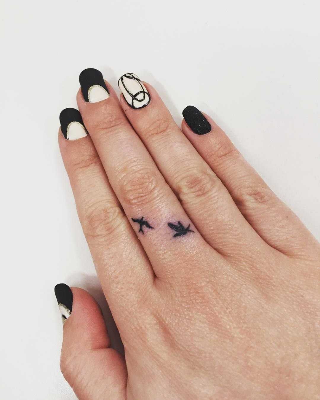 - Безымянный палец олицетворяет Венеру. Это планета чувств, эмоций, любви. Не зря обручальные кольца носят именно на безымянном пальце. Можно обойтись без стандартных перстней, сделав тату на пальцах. Такое кольцо не снимешь, не потеряешь.