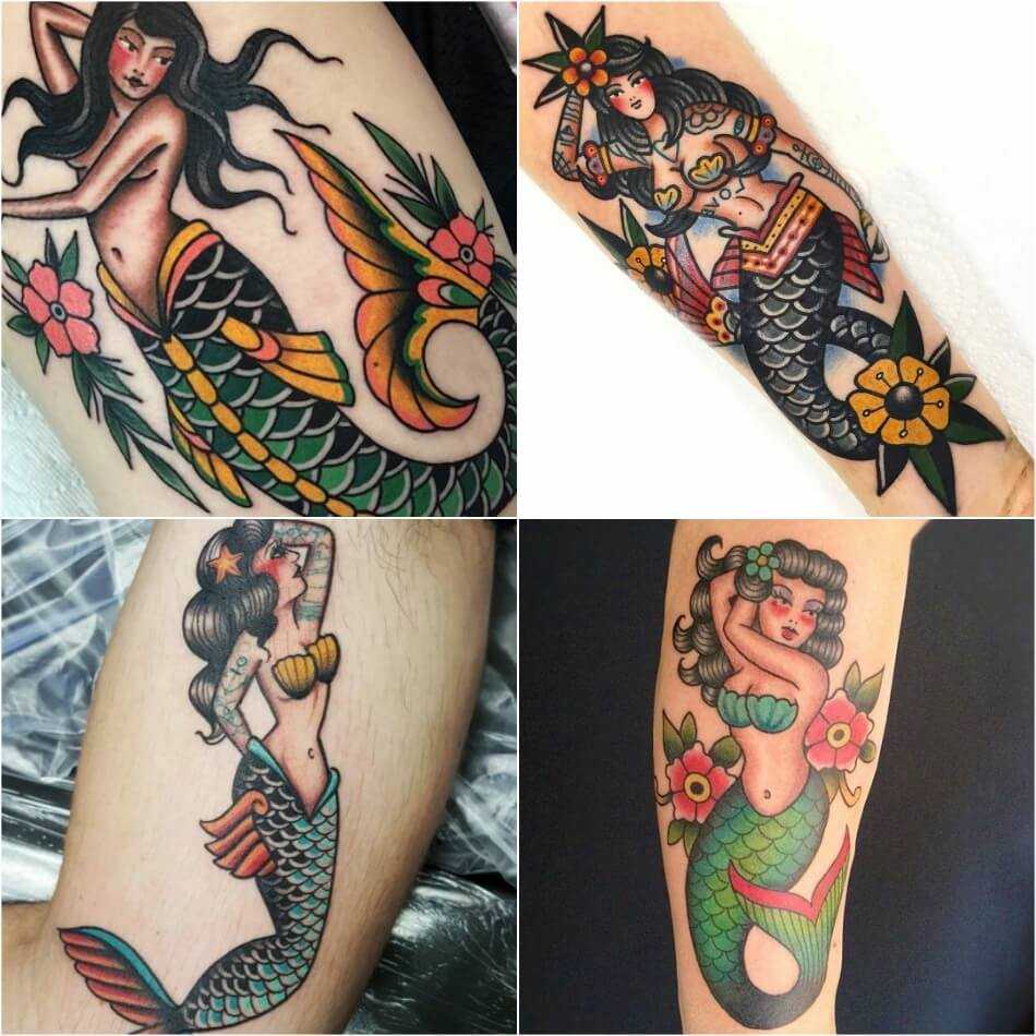Тату русалка (в некоторых вариантах сирена) в стиле олдскул ассоциируется с красотой, соблазном и опасностью, которое несет море. Это мифическое существо сулило морякам и удачу и смерть в равной степени.