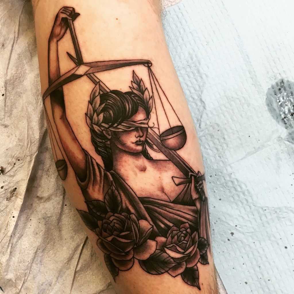 Имя Фемида буквально означает «божественный закон» и служит подходящим и привлекательным образом для татуировки Весы. Она изображена как красивая женщина в облачении, иногда с завязанными глазами и с мечом, помогающим расшифровать правду.