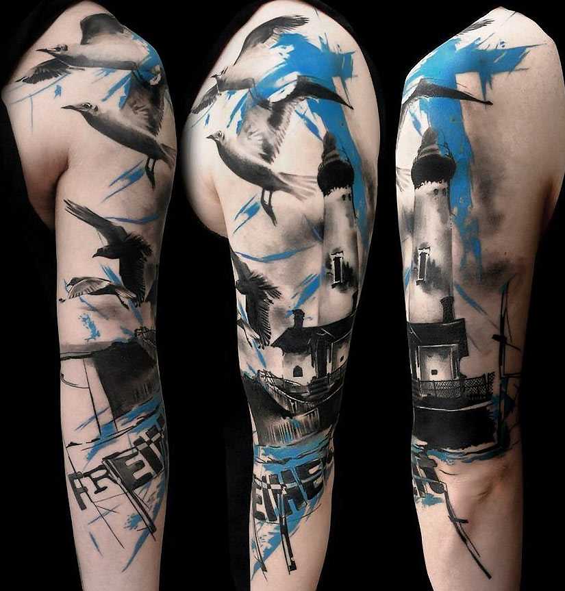 Оригинально выглядят тату, выполненные в стиле трэш-полька. Они нередко делаются с добавлением дополнительных цветов, чаще всего – красного. Он оттеняет основную канву, хорошо контрастирует с голубым небом и белыми облаками. Часто изображение может быть абстрактным, мастер не придерживается каких-то строгих правил, анатомии и т.д.