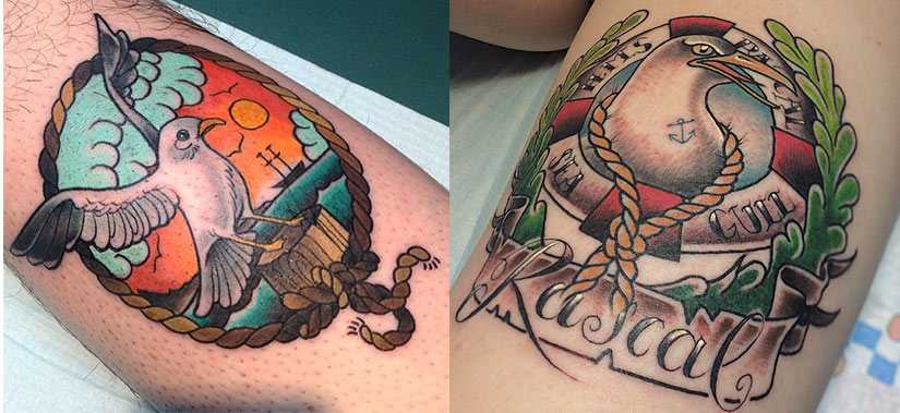Для моряков эта птица ассоциируется с сушей, домом, родными и близкими, поскольку обитает она на побережье. Появление чаек на корабле издревле является хорошим, добрым знаком, приносит удачу, обещает скорое возвращение домой. Татуировка чайка – неотъемлемый атрибут не только моряков, но и рыбаков. Эскиз татуировки с изображением чайки выполняется, как правило, в цвете, а наносят изображение на плечо, грудь, спину и другие места.