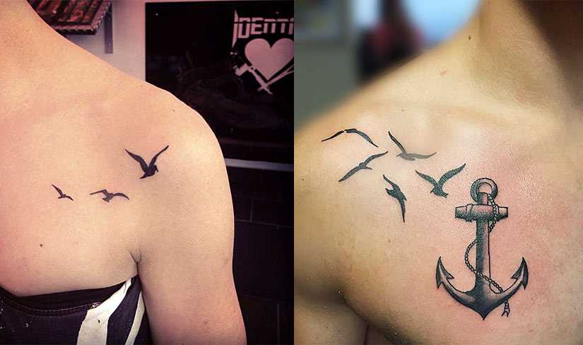 Татуировка с чайками может символизировать способность преодолевать трудности и переживать неприятности, так же, как чайки летают даже в сильные ветры.