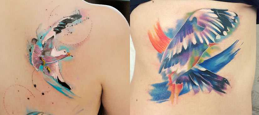 То же самое можно сказать о тату в стиле акварель. Подобную технику обычно предпочитают девушки из-за нежности и воздушности изображения. Эскиз тату с чайкой, парящей над морской гладью, является любимым сюжетом. Его можно носить на руке, спине, предплечье или на ключице. Миниатюрное тату на запястье также подойдет представительницам прекрасного пола и выгодно подчеркнет их хрупкость и красоту.
