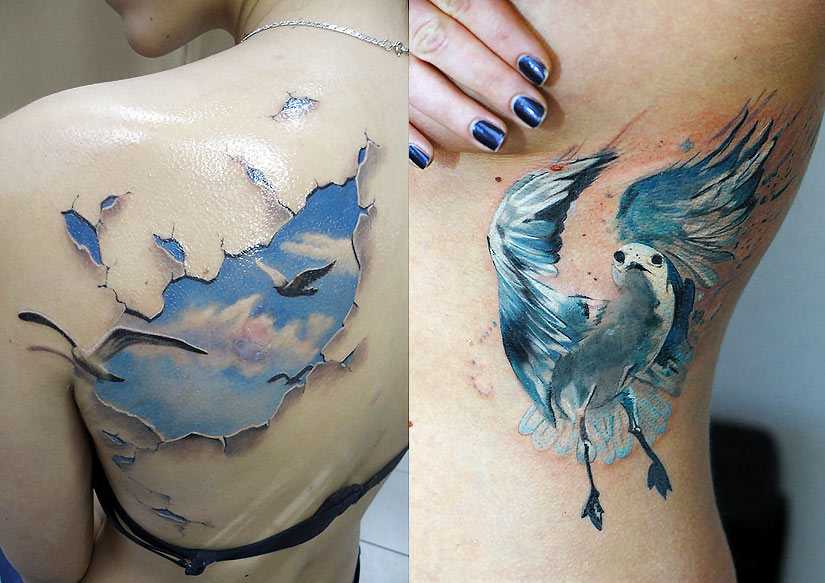 Вы хотите поразить окружающих необычной татуировкой? Можно сделать небо, прорывающееся сквозь кожу и оттуда вылетают свободные птицы. Знак свободы разума от мещанских условностей.Вам хочется изменить рисунок, который вы давно набили? Это вполне возможно; можно поверх состарившегося изображения набить цветное, современное. Также рассмотрите для себя вариацию уникальной набивки — такой, которой точно не будет ни у кого из ваших знакомых. Вот вам сразу несколько вариантов:
