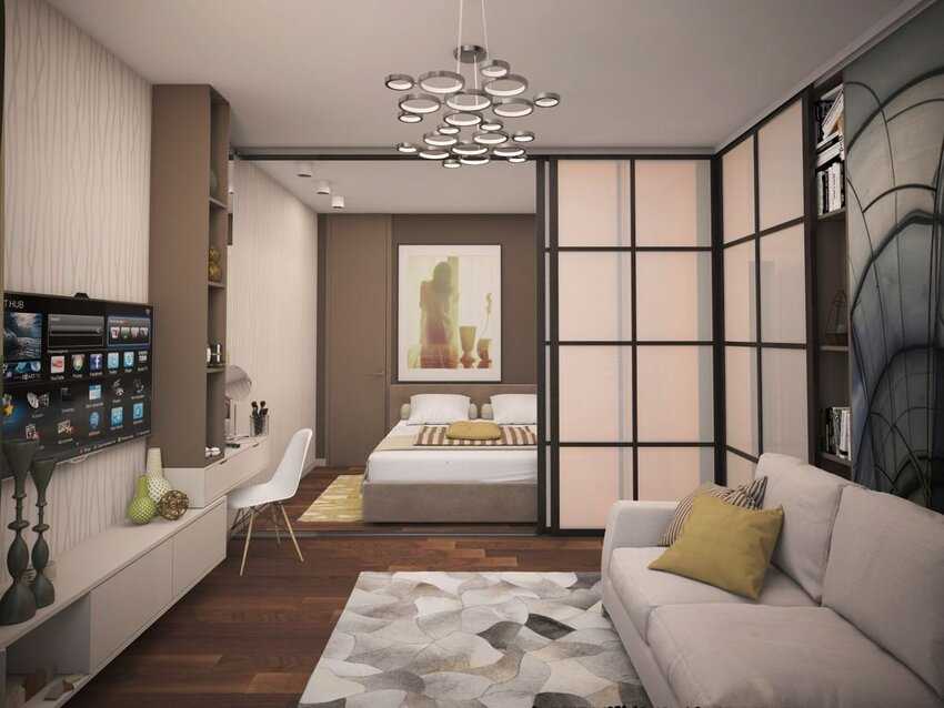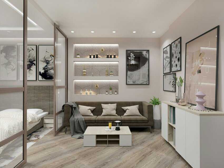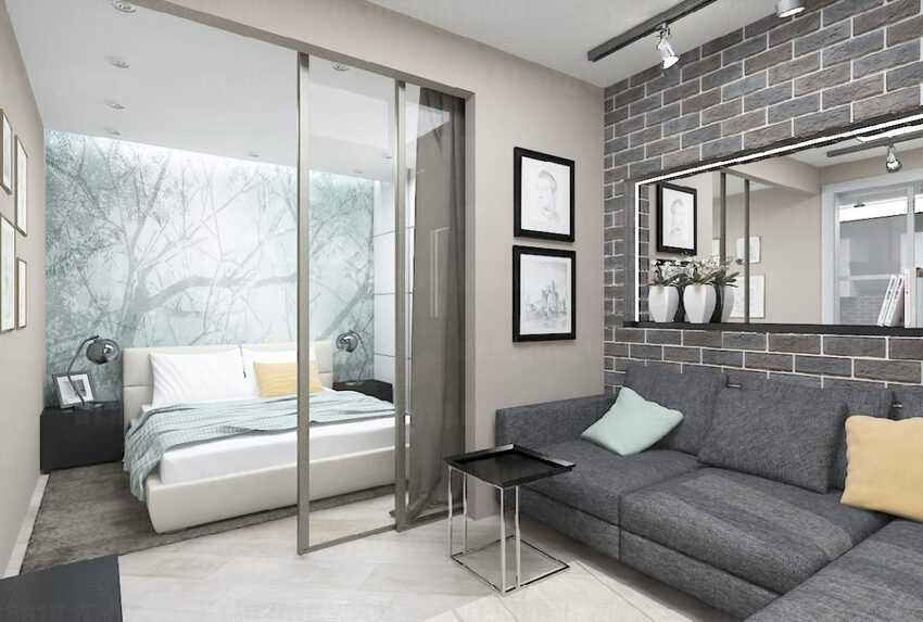 Если спальное место отделяется от гостиной посредством функциональных перегородок (закрывающих его от пола до потолка), то стоит выбирать напольное покрытие, схожее по цвету с тем, что располагается в гостиной.