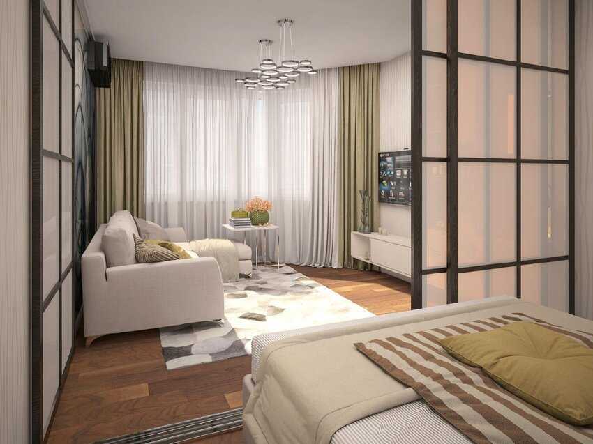 Если спальня отделяется перегородками, которые выполняют больше декоративную функцию, например, шторами, занавесками, стеллажами, следует выбирать покрытие, схожее с тем, что присутствует в гостиной.