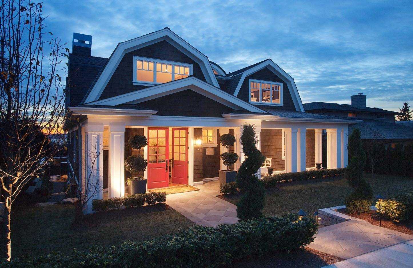 Чаще всего на данных крышах имеются окна на треугольных скатах. Этот вариант отличается эстетичным видом и пользуется наибольшим успехом при постройке частных особняков. Такая кровля более устойчива к порывам ветра и обильным осадкам.