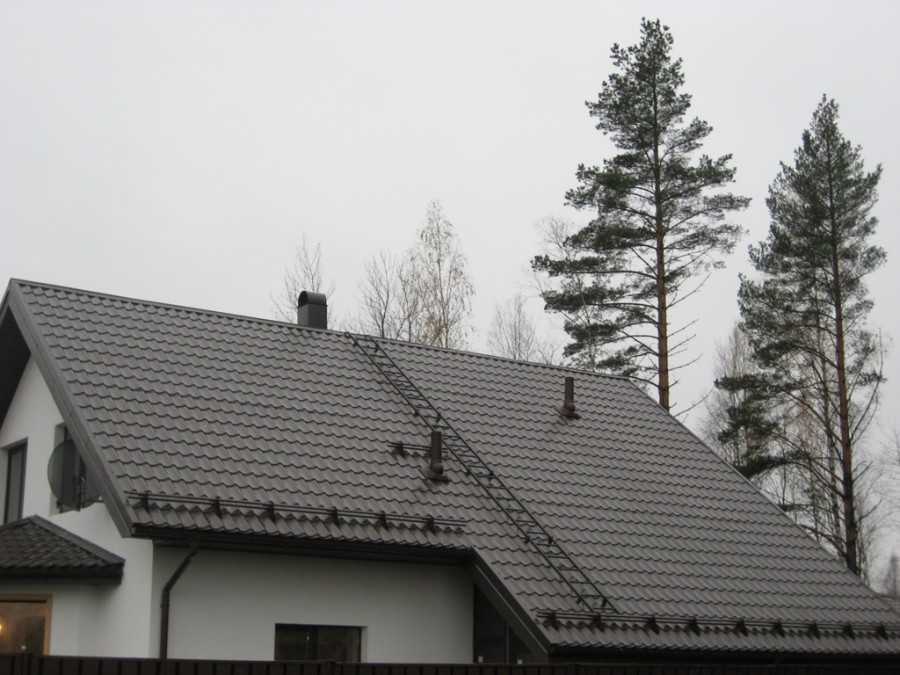 Металлочерепица. Это универсальный кровельный материал. Он довольно легкий (5 кг на 1м²) и состоит из листов оцинкованной стали. Металлочерепица очень скользкая, поэтому в зимнее время следует ограждать придомовую территорию на случай сползания большого количества снега. При покупке данной кровли лучше отдать предпочтение проверенным импортным производителям, например, Руукки (Финляндия) с толщиной листа 0,5 мм.
