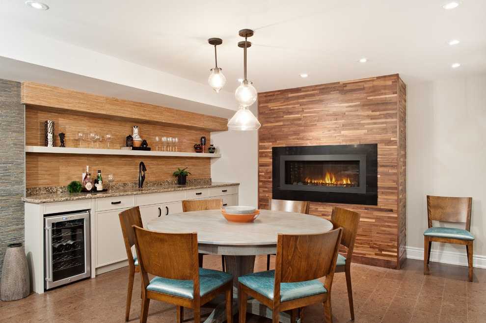 Ламинат на стене в интерьере кухни можно использовать в качестве акцентной стены и фартука на столешнице, который защитит от брызг и его легко содержать в чистоте. Цвет должен сочетаться с фасадами кухни. Чтобы выделить обеденную зону, можно сделать стену из ламината темного дерева.