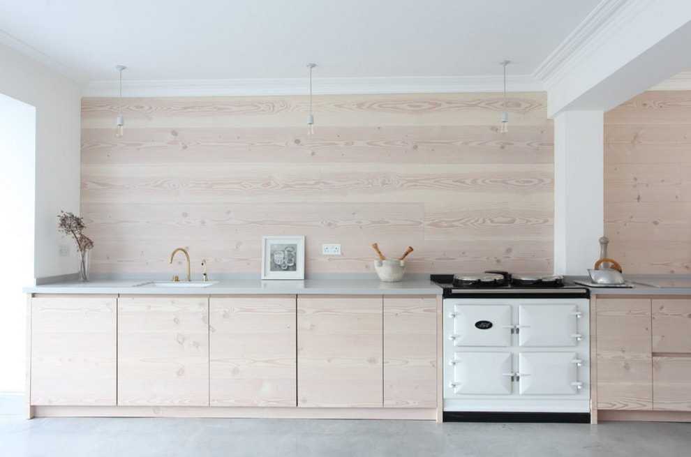 Стена из вертикально уложенного ламината визуально увеличивает высоту потолка, потому такой прием можно эффективно использовать в низких кухнях.
