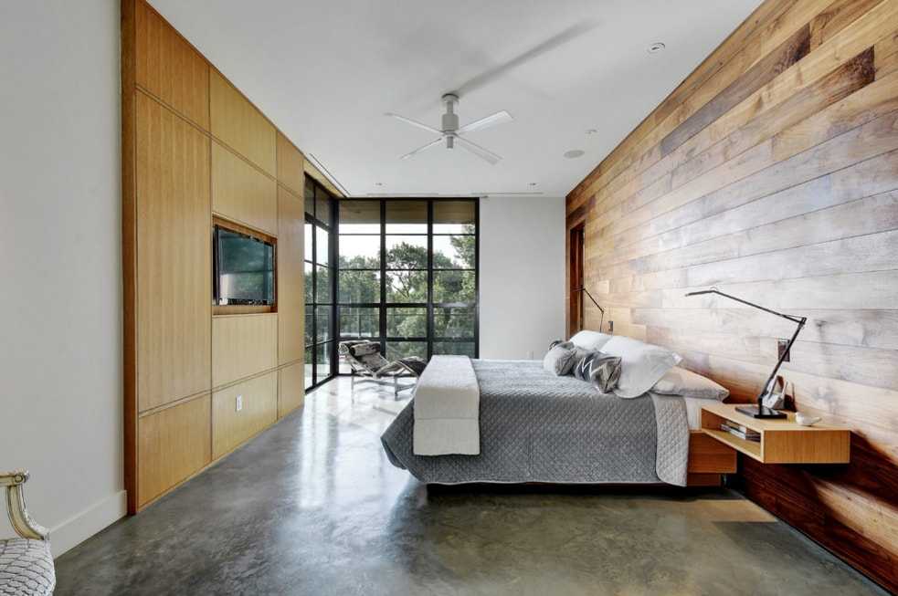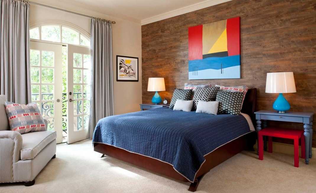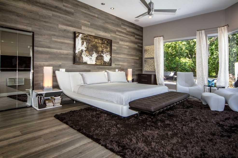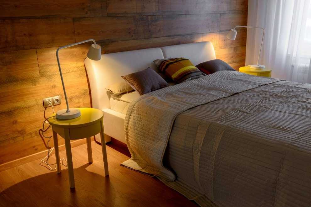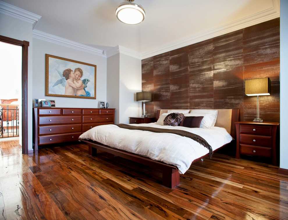 Ламинат на стенах можно использовать, если в спальне будут крашеные или глянцевые двери и крупные металлические предметы.