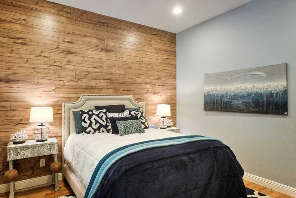 Ламинат на стене спальни можно использовать в качестве вставки над изголовьем кровати. Если спальня большая, можно покрыть всю стену ламинатом и побелить ее, повесить красочные аксессуары и фотографии в рамке. Ламинированная стена у изголовья в цвет кровати создаст уютную атмосферу.