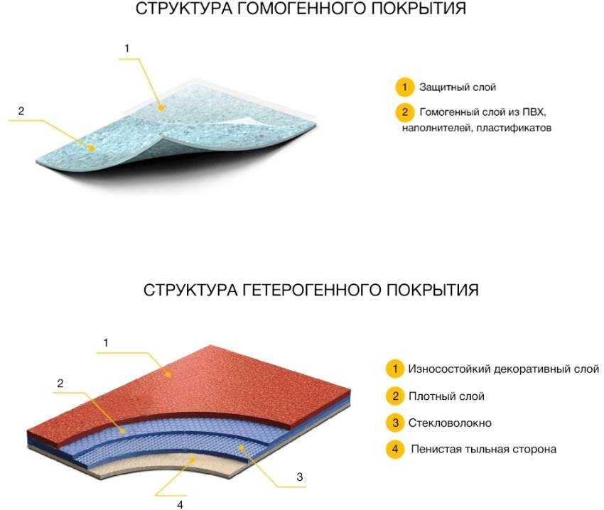 Гетерогенный линолеум, напротив, характеризуется многослойностью и имеет неофициальное название «сэндвич». Состоит полотно из стеклохолста, вспененного слоя, в котором сформирован рисунок, специальной подложки и ламинированного слоя. Многослойный линолеум характеризуется стойкостью к механическим нагрузкам и деформации, он может прослужить до 15 лет.